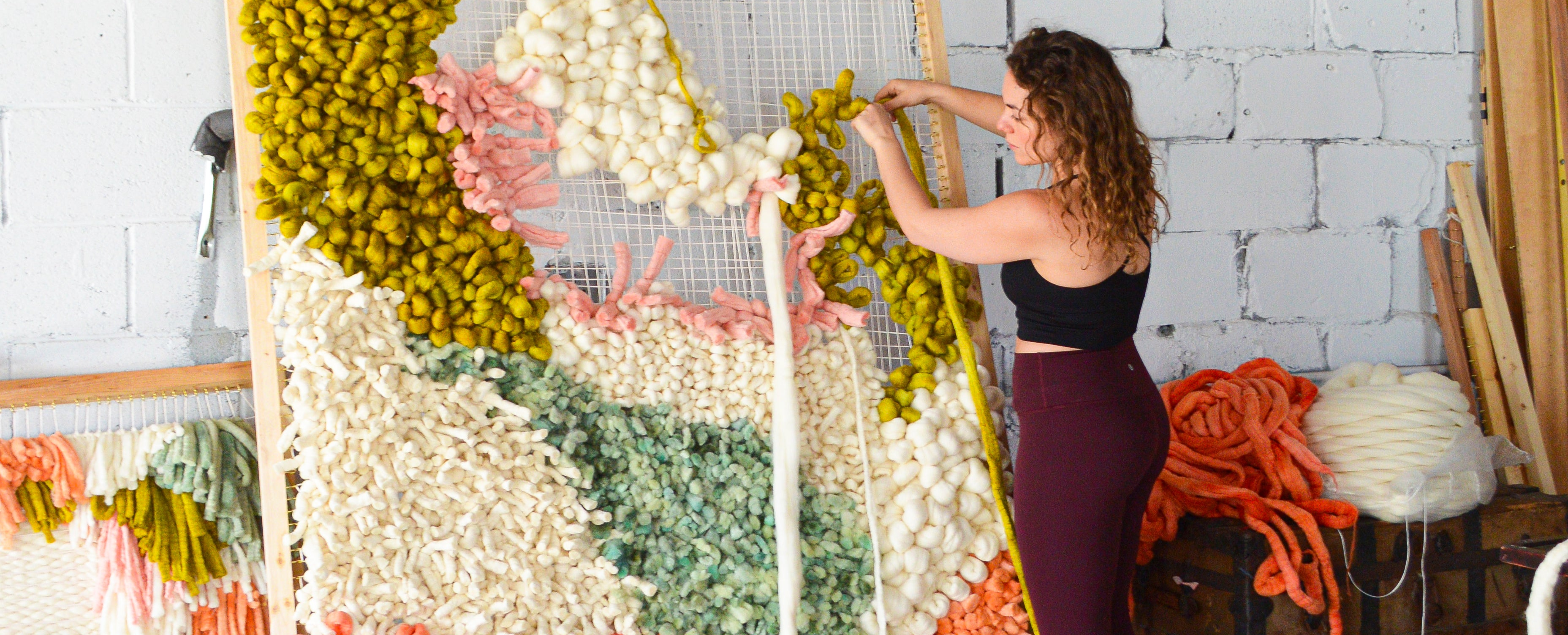 I'm a Denver based fiber artist. My highly textured and experimental wall hangings are crafted from hand dyed and felted Merino wool. You can shop my collection of available artwork or order a custom piece for your space right here, welcome!