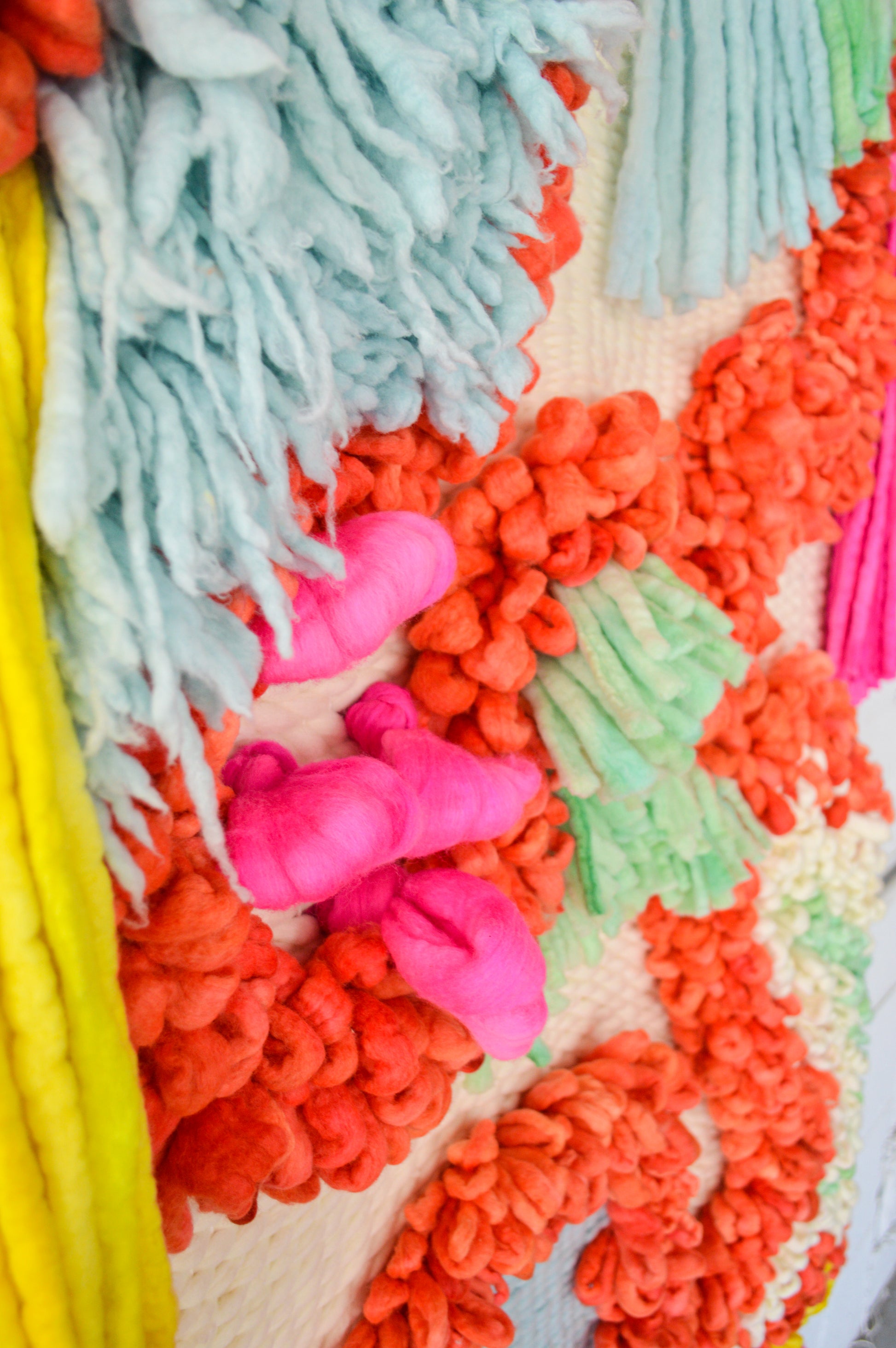 This weaving is ready to ship! Made from 100% hand dyed and felted merino wool and boasting all the colors of an underwater dreamland, this is a fun statement piece. I originally came up with the idea for this work after scuba diving for the first time. I was awed by all of the vibrant colors and magical shapes under the water and I hope this piece will bring its viewers to another world in that same way.