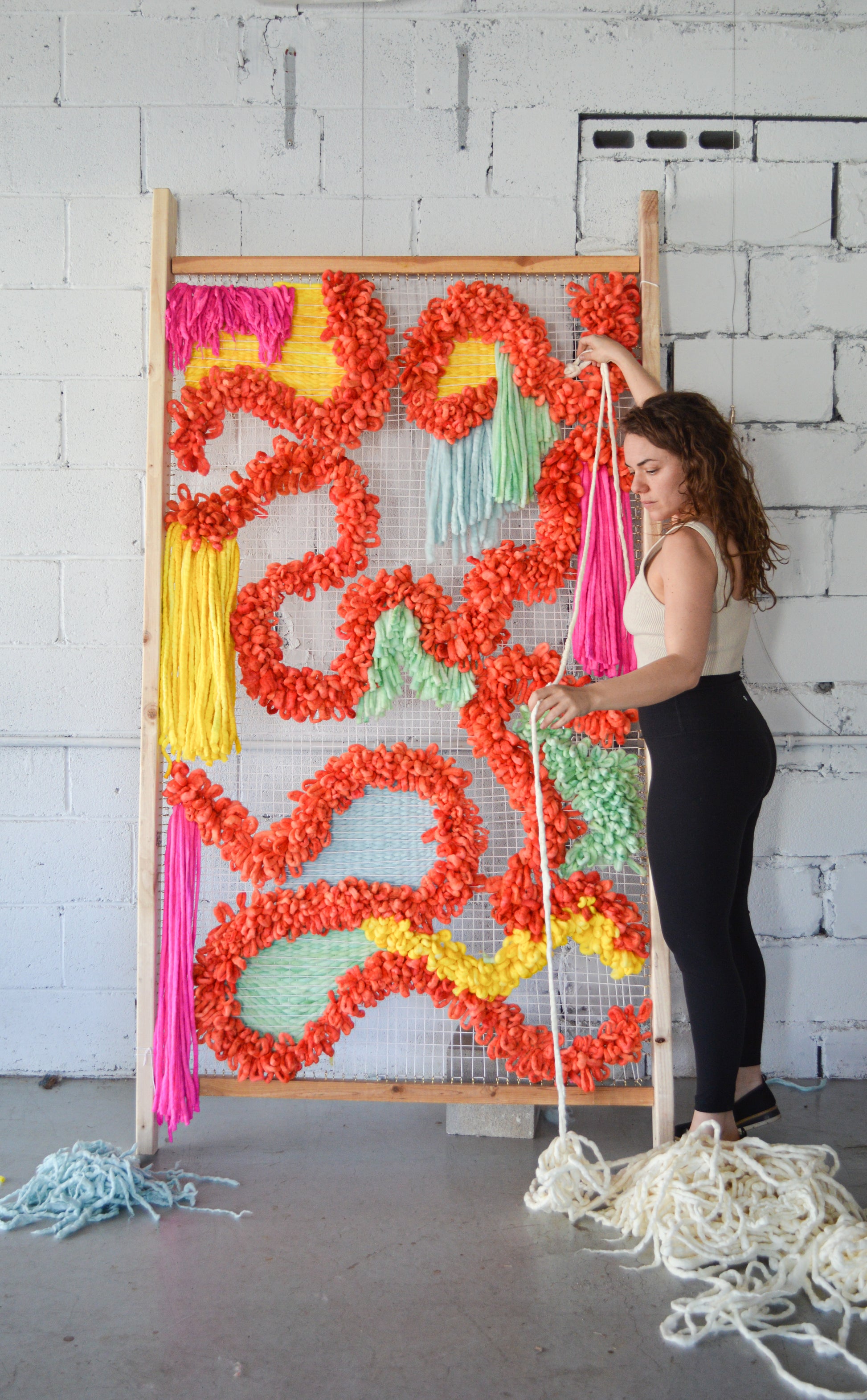 This wall hanging measures 3.5 ft long x 7ft tall and stands out from the wall approximately 7 inches. Crafted from hand dyed and felted merino wool. You can follow along on instagram to learn more about this work's construction materials
