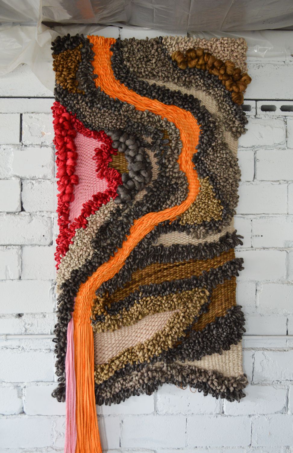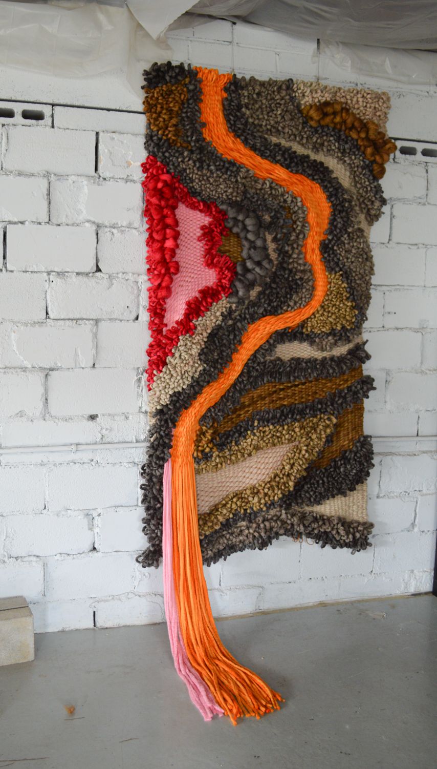 Crafted with hand-dyed yarns, chunky boucle, and twisted strands, Fault Line layers earthy neutrals—taupe, clay, ochre, and charcoal—with deep crimson and a striking current of molten orange. These colors ripple through the surface like tectonic waves, while the varied textures mimic rock strata, lava flows, and sediment layers.