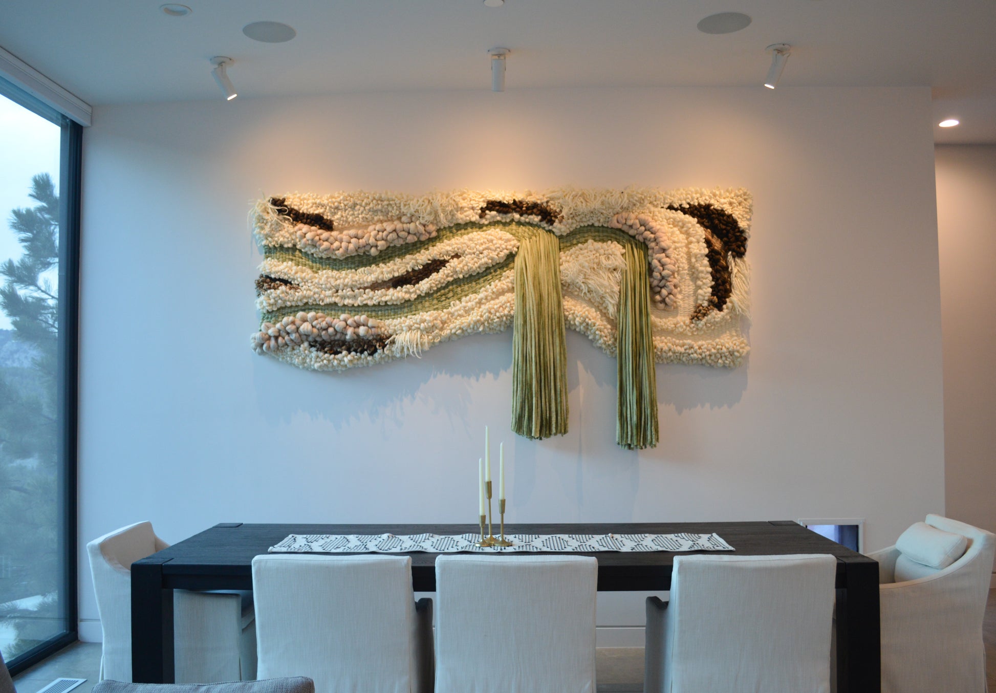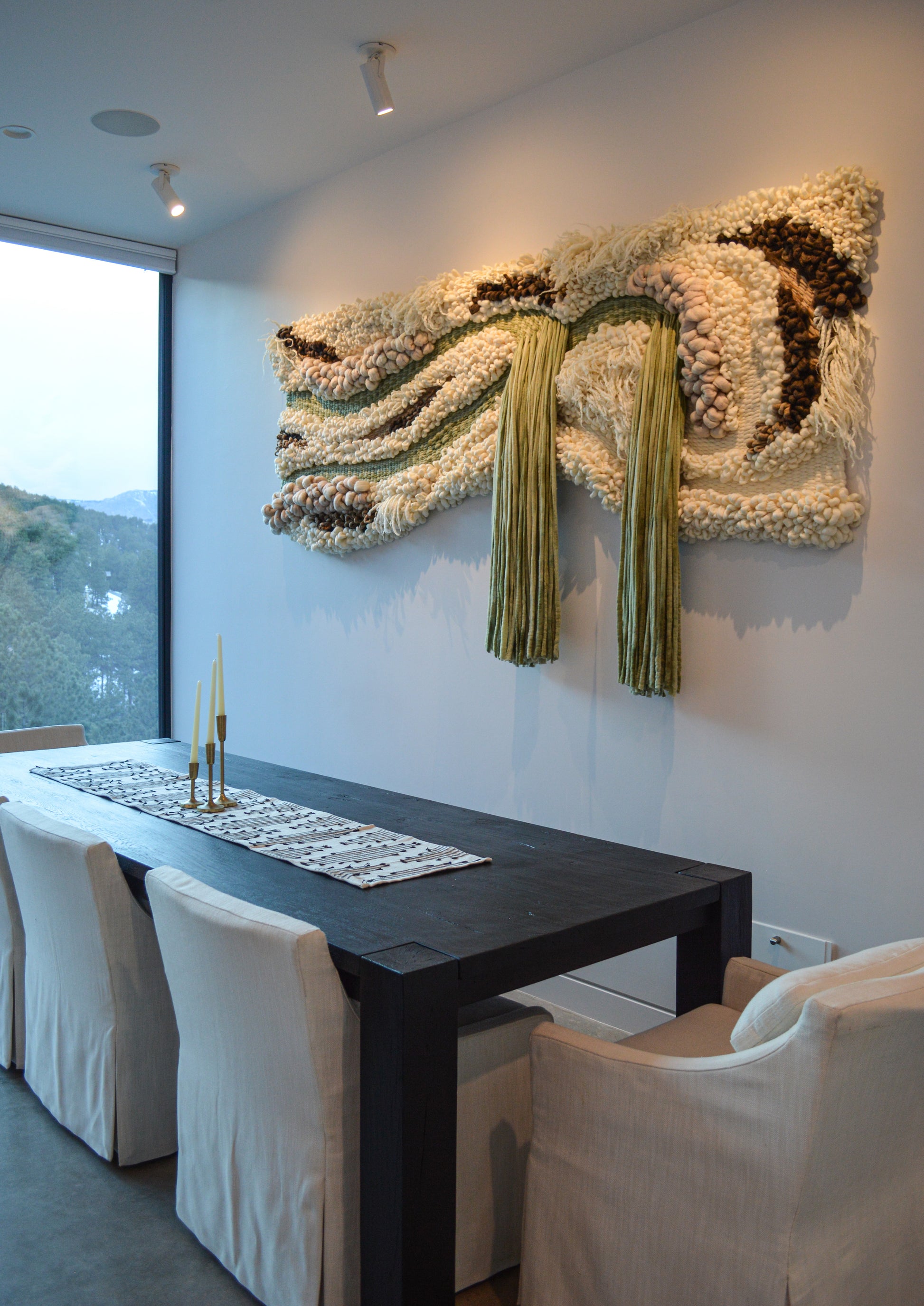 This design is intended to bring the outdoors "in" and was originally a commissioned work which is now hanging in a private residence in Boulder, CO. I borrowed the curve of the foothills visible through the window used that line to form the design of the piece. The colors are inspired by the woods and the rich greens and browns of the forest are reflected in this piece of art. I think this piece would make a beautiful addition to any mountain retreat.