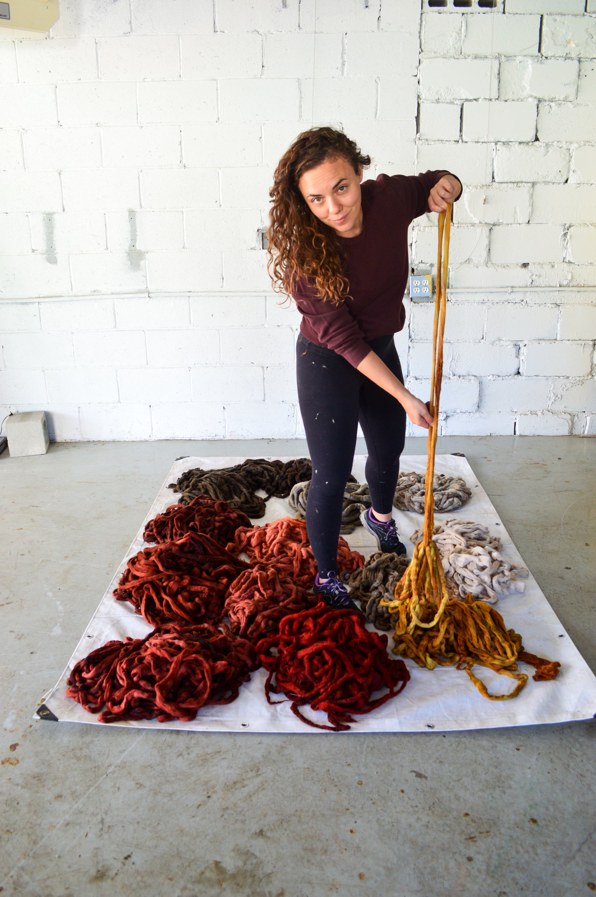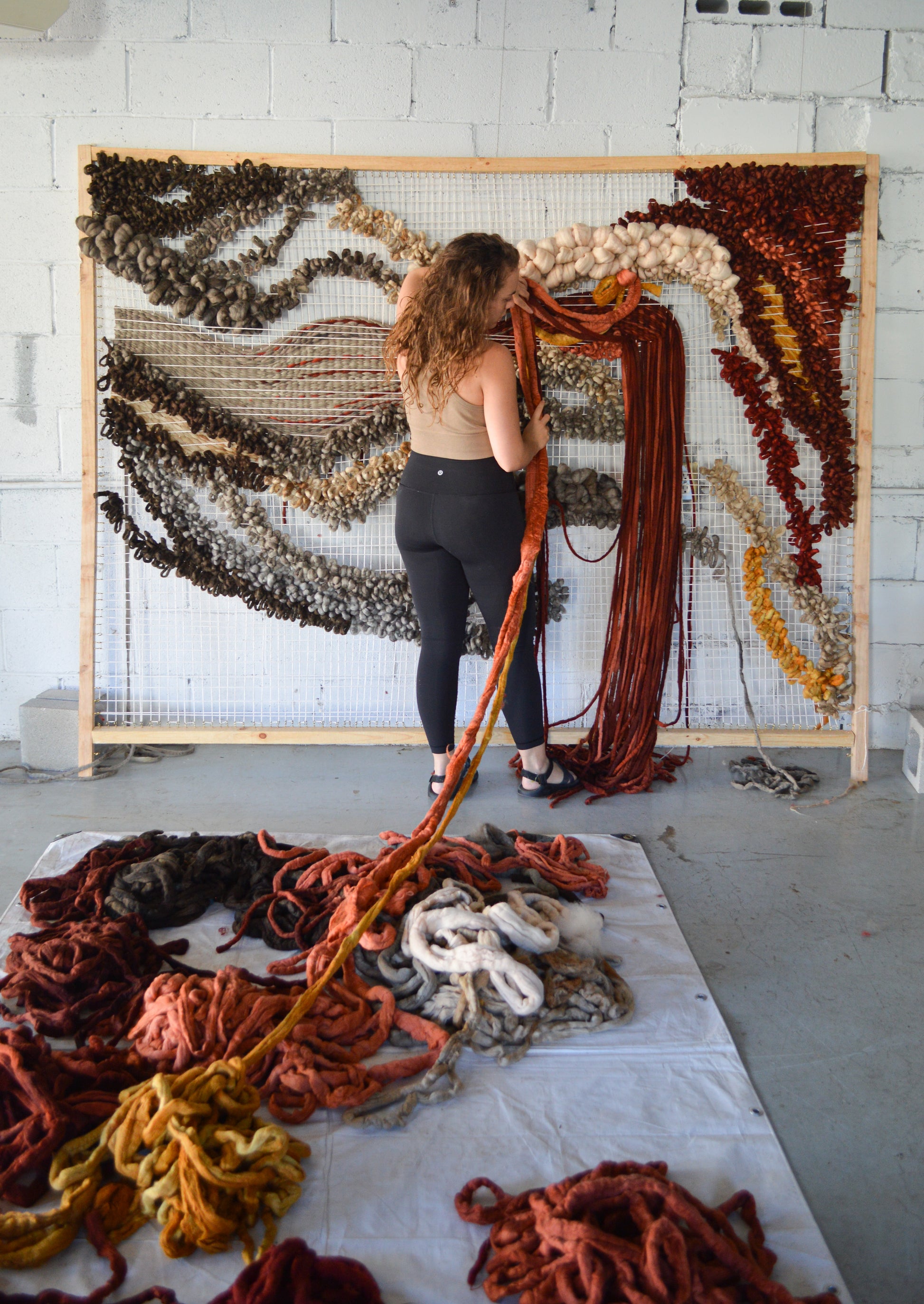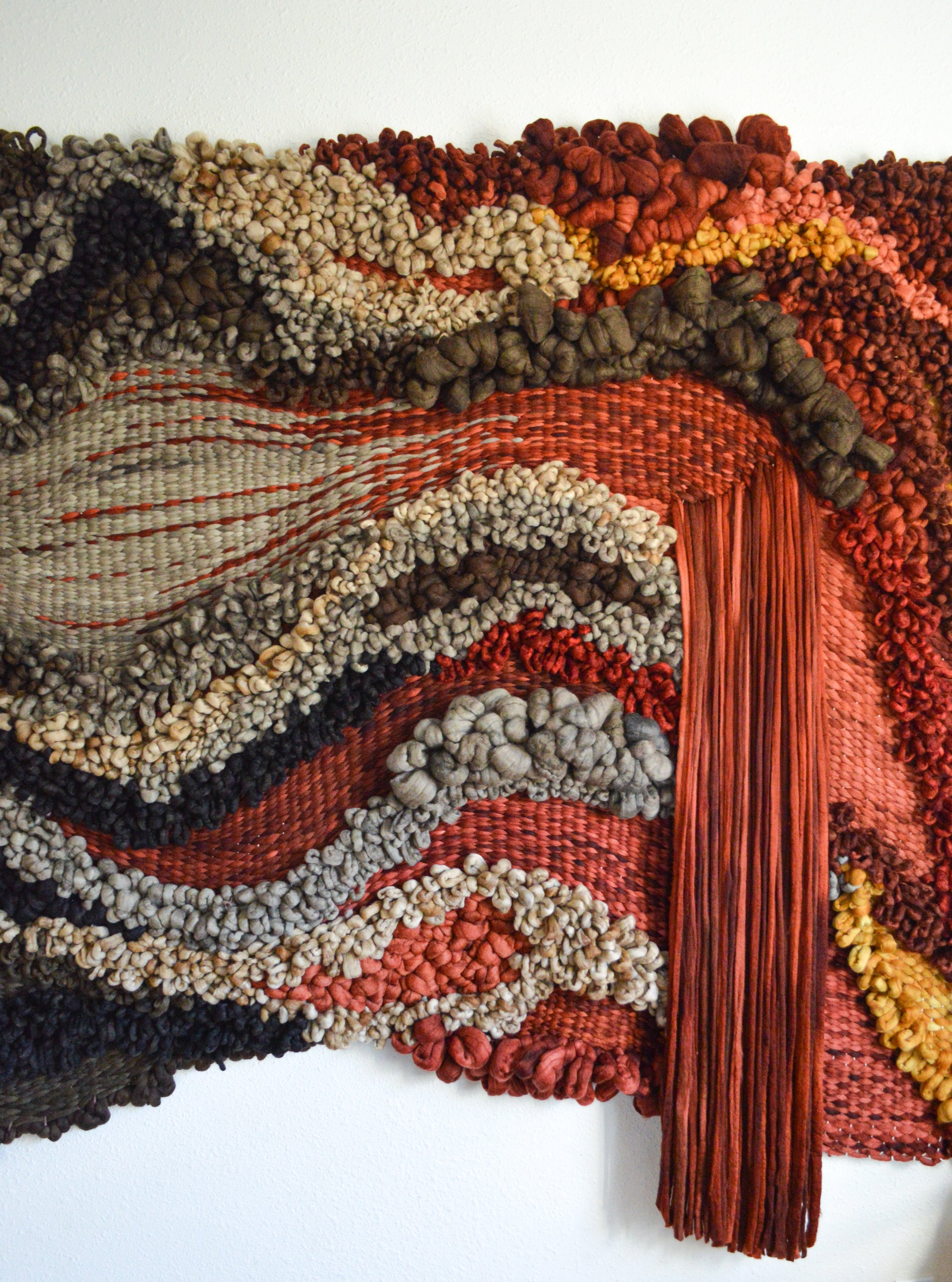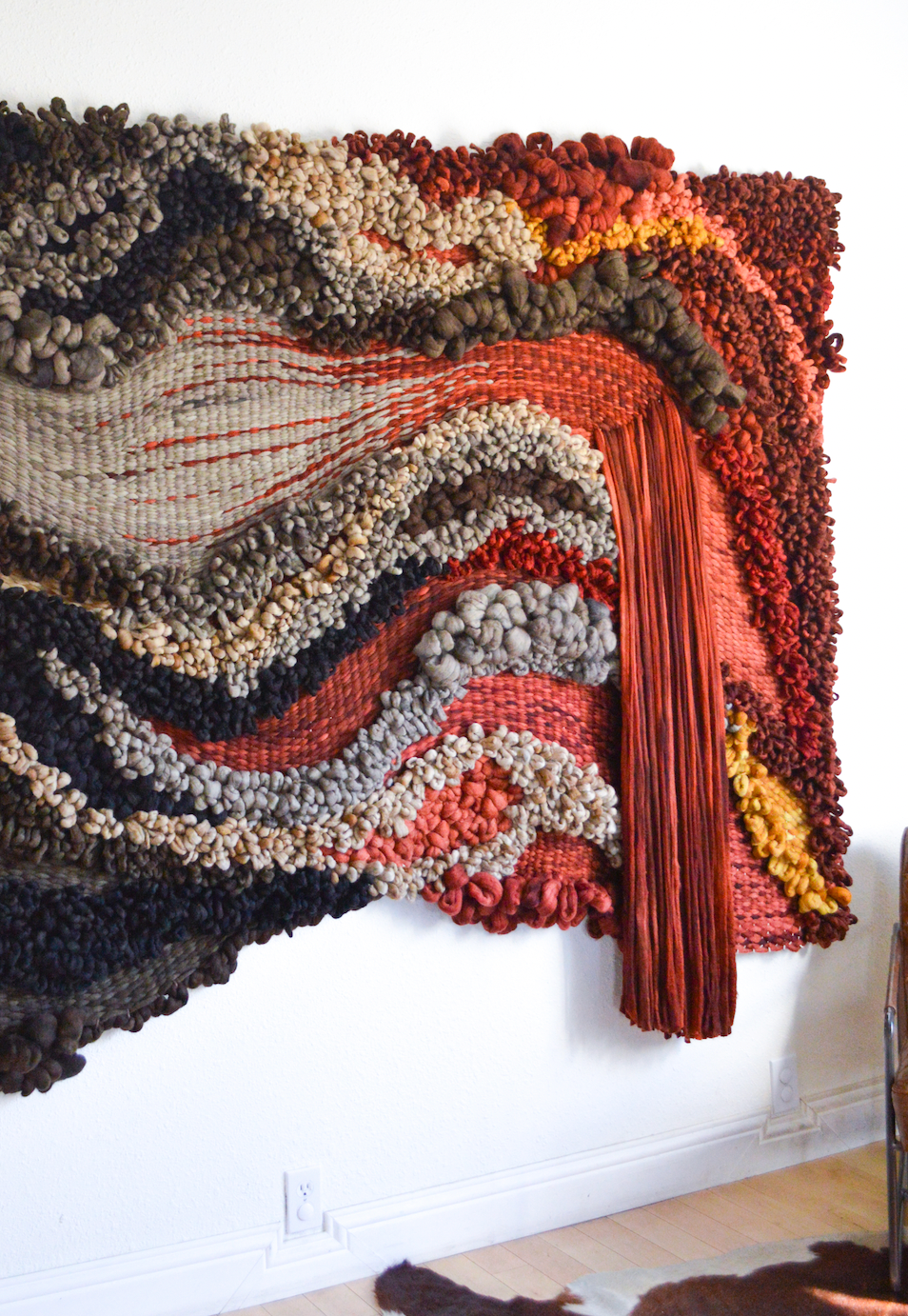 This wall hanging measures 7 ft long x 6ft tall and stands out from the wall approximately 7 inches. Crafted from hand dyed and felted merino wool. You can follow along on instagram to learn more about this work's construction materials