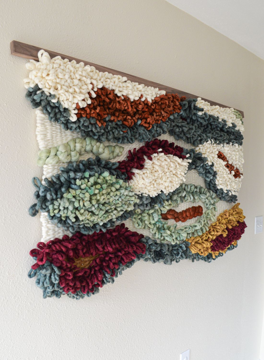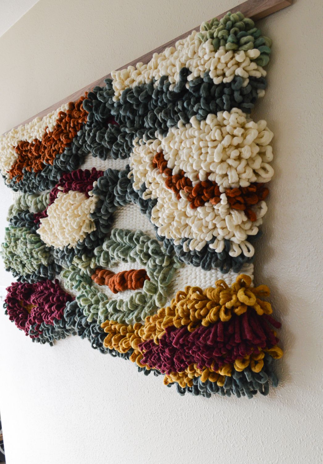 Each section is a celebration of tactile contrast—plush loops, sculptural knots, and fluid shapes come together to mimic the patterns of rugged terrains and shifting landscapes. Mounted on a clean wooden rod, this artwork brings a warm, modern statement to any room.