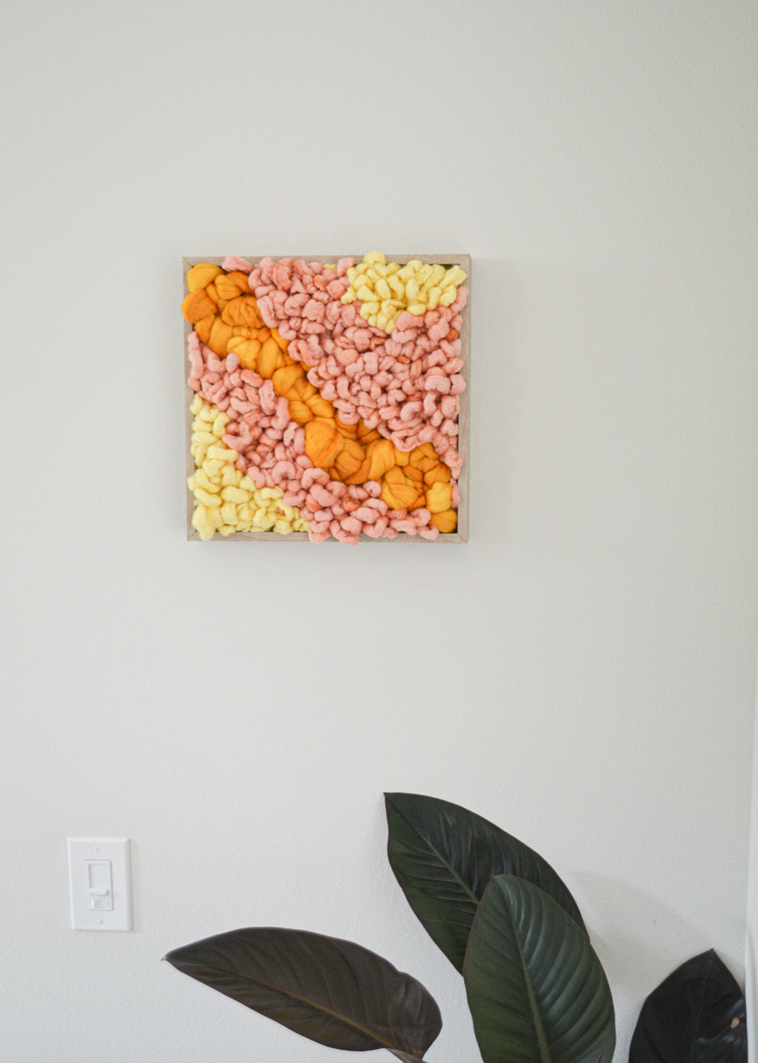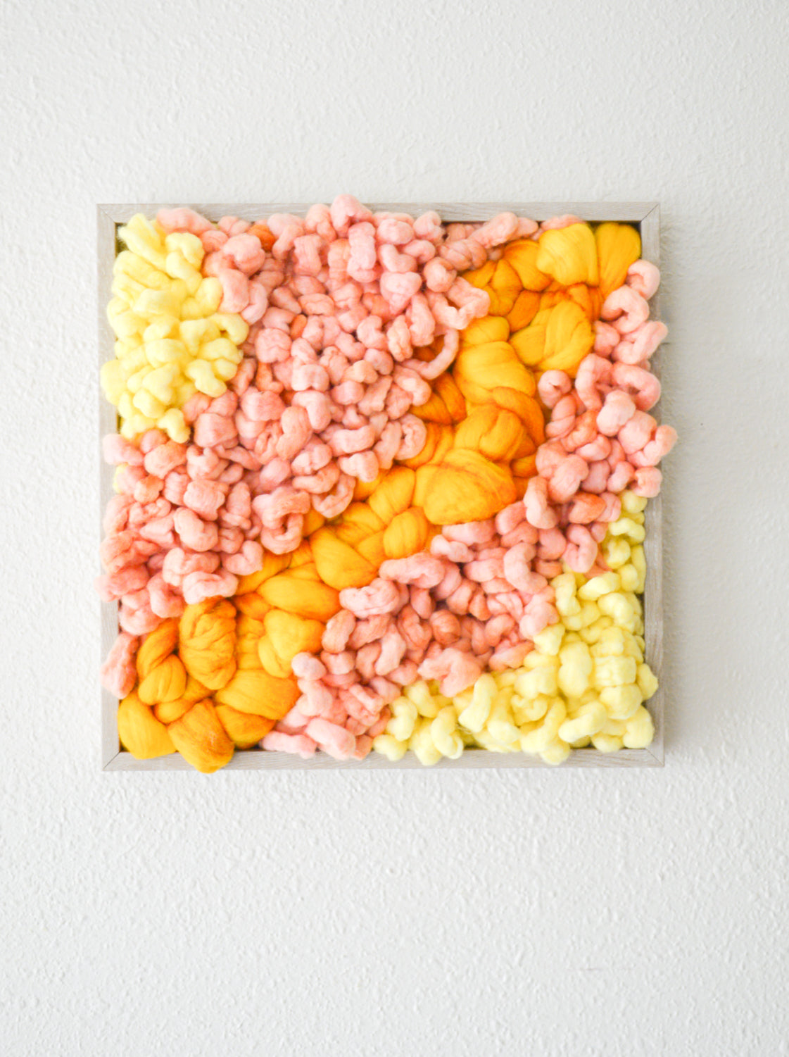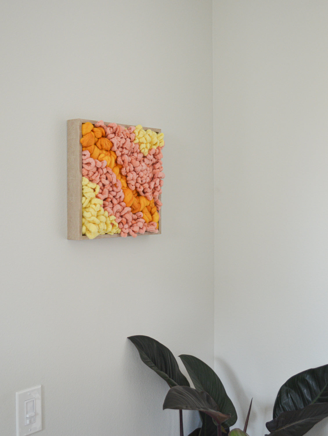Framed in Nordic white oak, the clean lines provide a crisp contrast to the whimsical textures within. The frame gives structure without overpowering — a gentle boundary that lets the fiber art shine like a scoop on a cone.