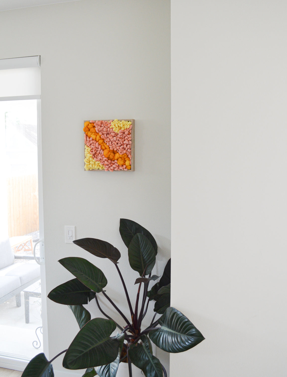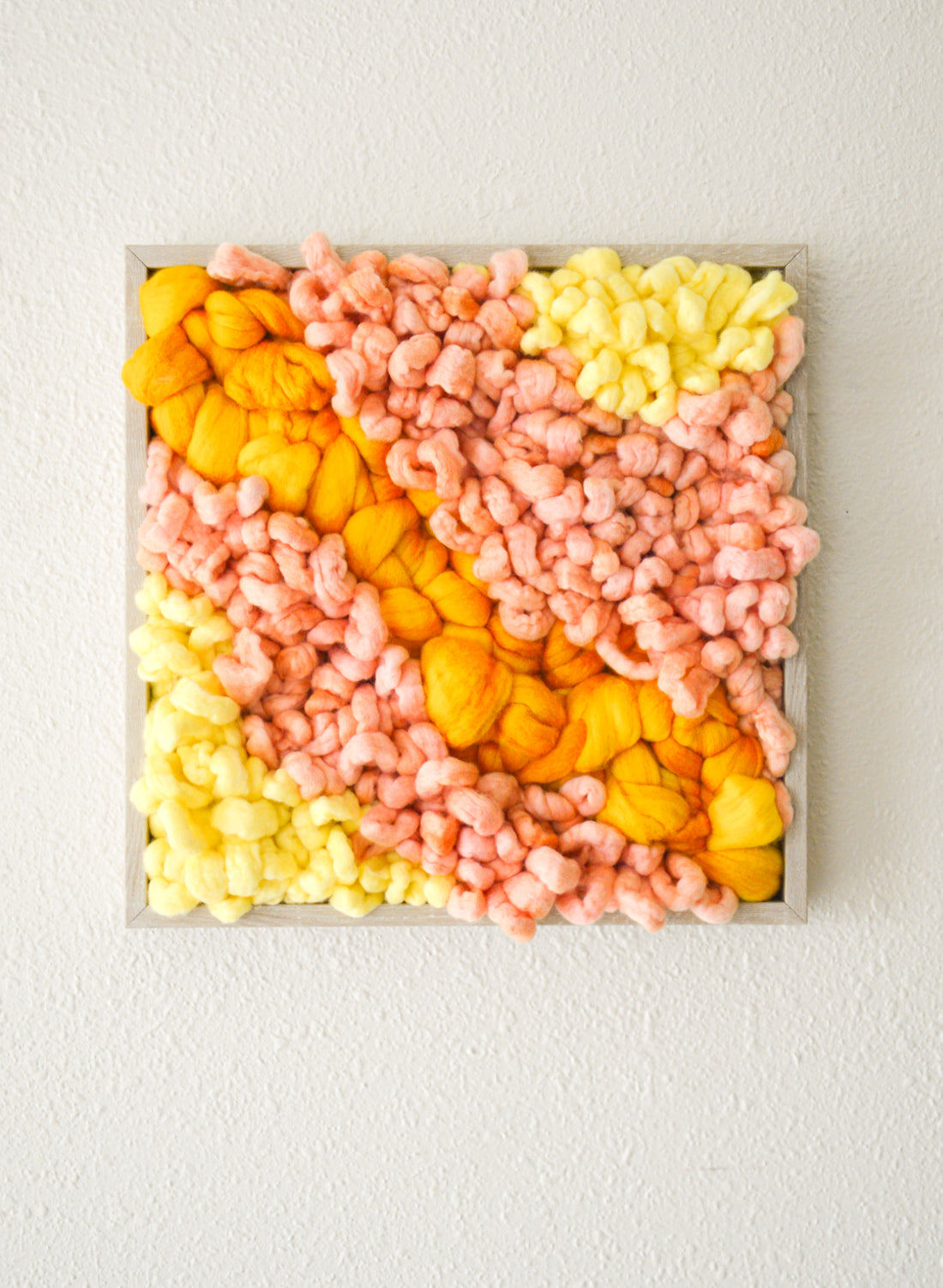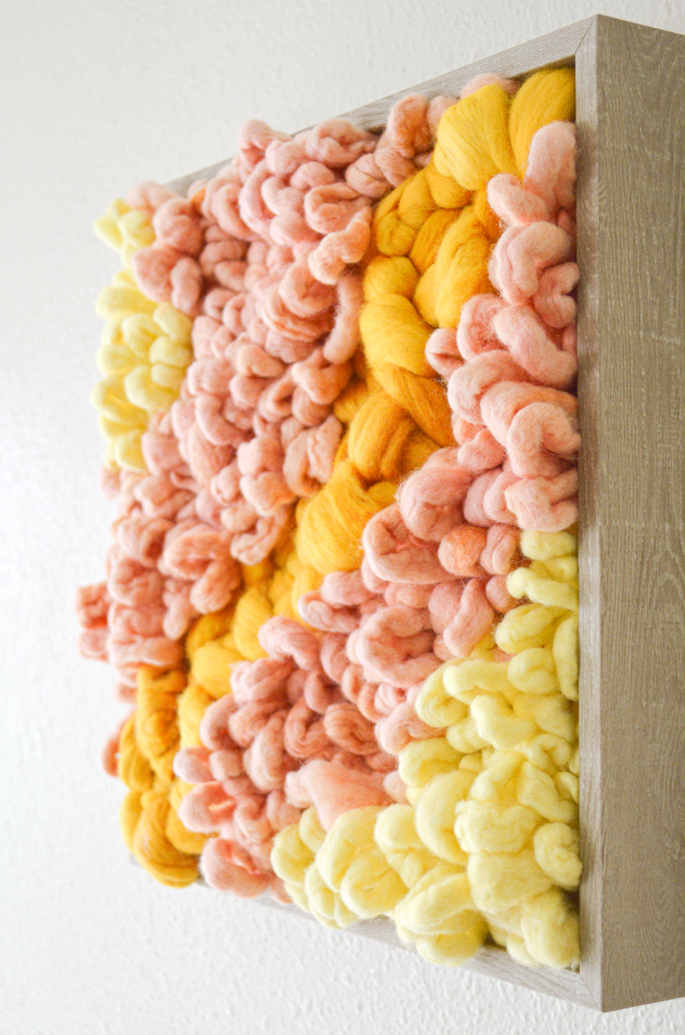 Framed in Nordic white oak, the clean lines provide a crisp contrast to the whimsical textures within. The frame gives structure without overpowering — a gentle boundary that lets the fiber art shine like a scoop on a cone.