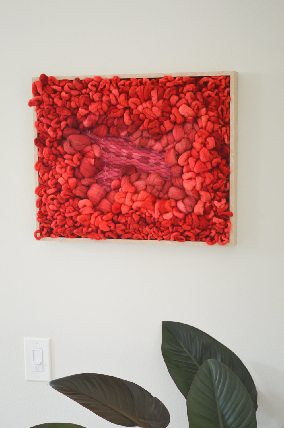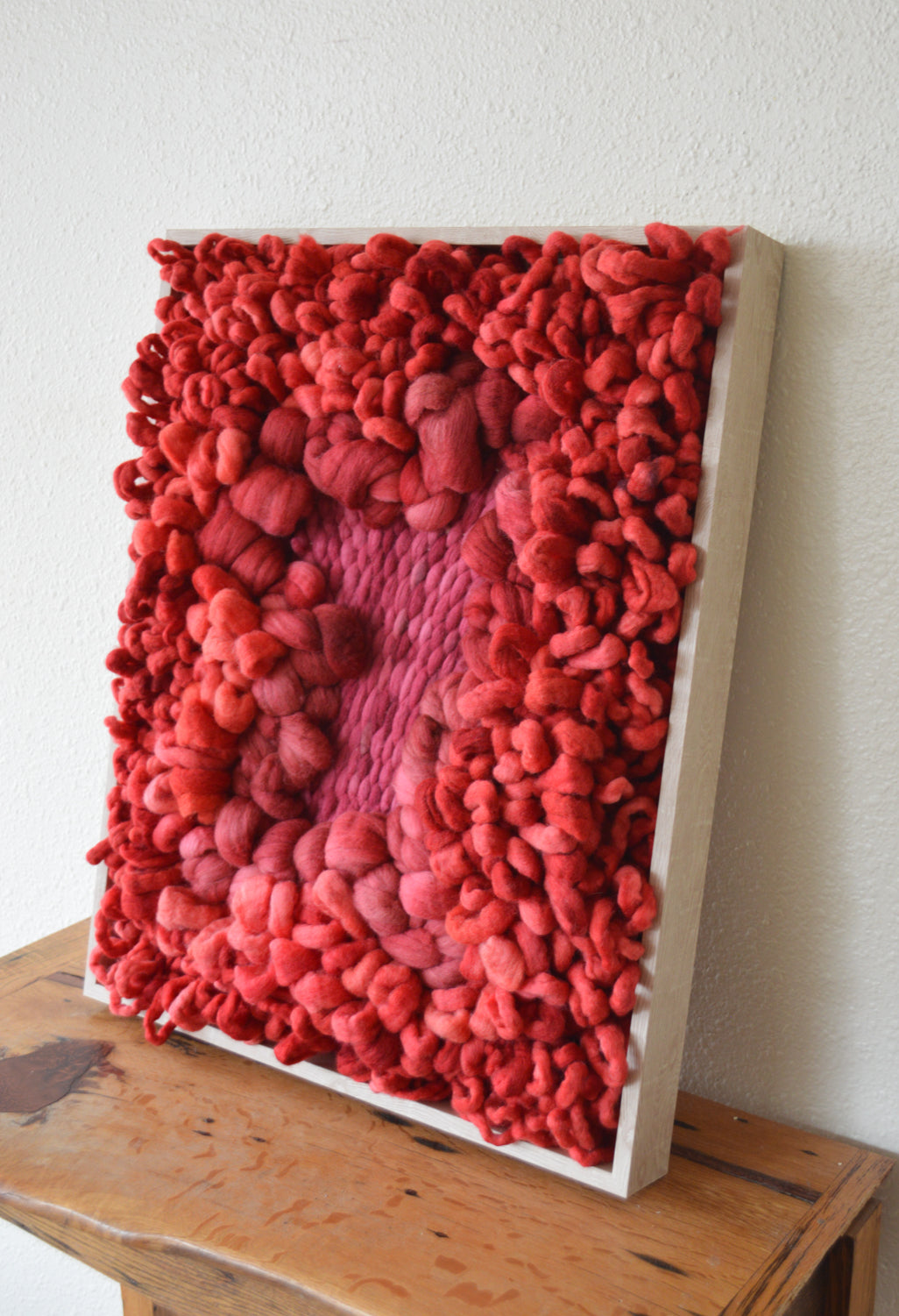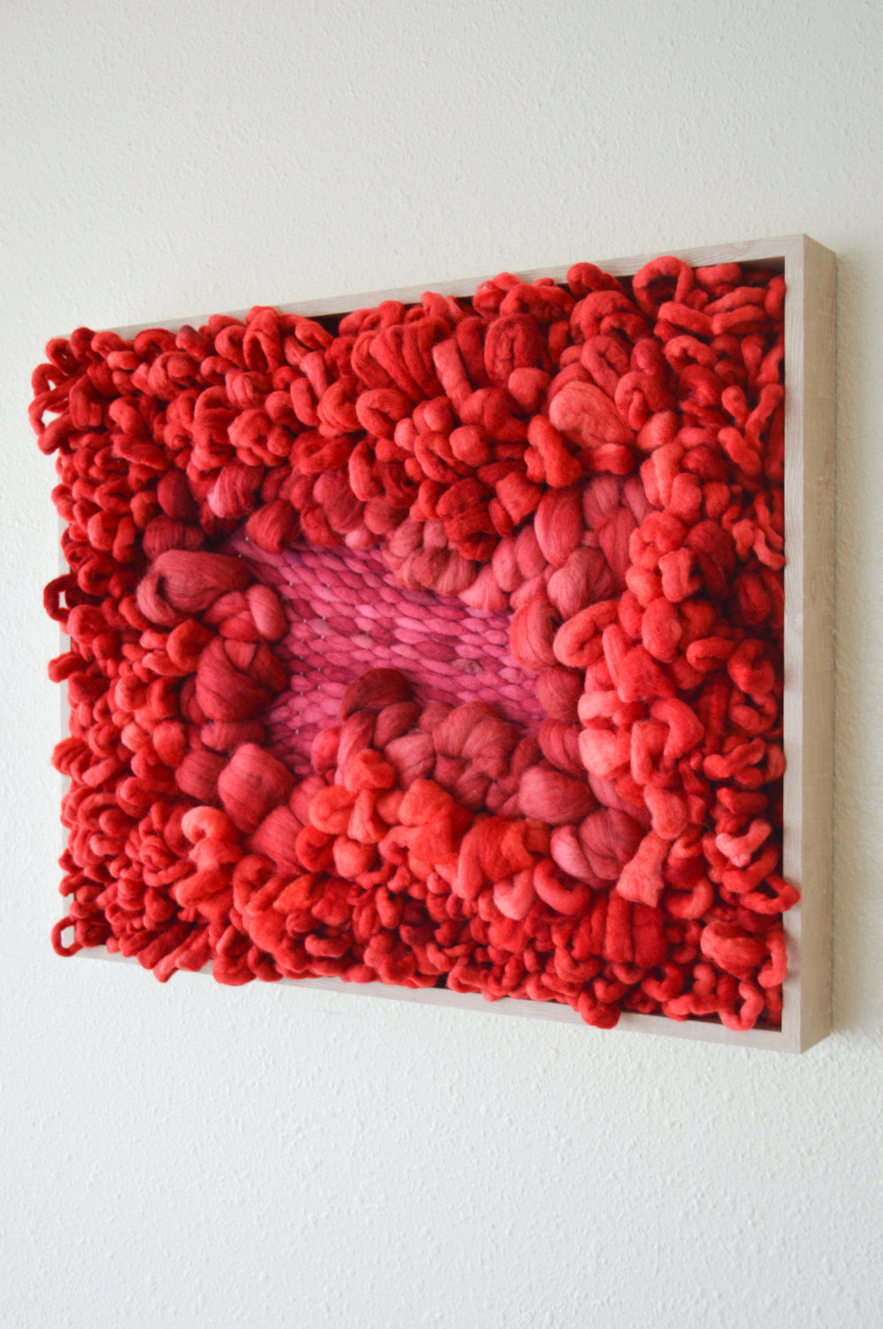 Handwoven with luxuriously soft Merino wool, the work blooms outward from a center of rich magenta tones, expanding into a wild mix of berry reds and juicy crimsons. The variation in fiber structure — from tightly coiled curls to velvety tufts — gives the piece a dynamic sense of movement, like the swirling of fruit and wine in a glass.