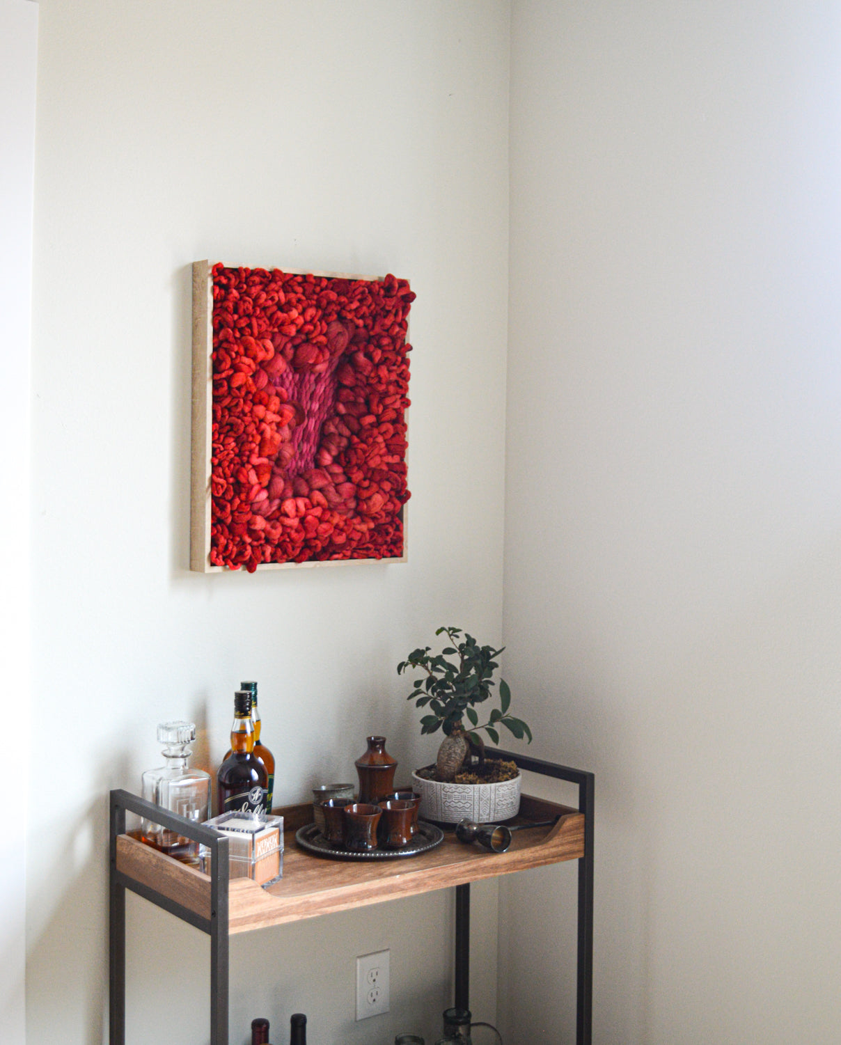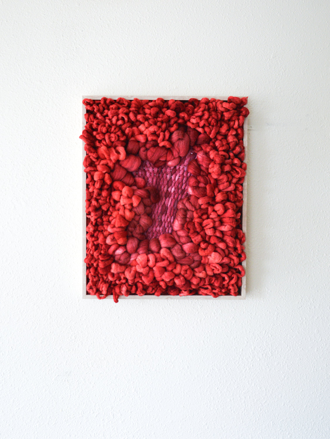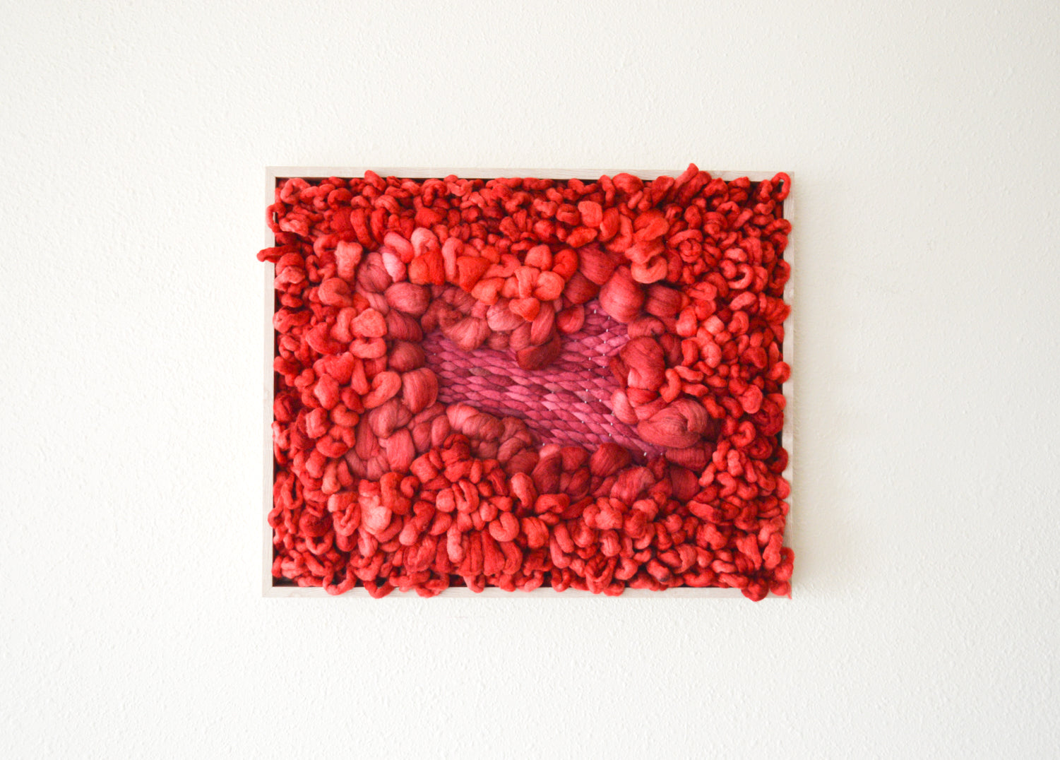 Handwoven with luxuriously soft Merino wool, the work blooms outward from a center of rich magenta tones, expanding into a wild mix of berry reds and juicy crimsons. The variation in fiber structure — from tightly coiled curls to velvety tufts — gives the piece a dynamic sense of movement, like the swirling of fruit and wine in a glass.