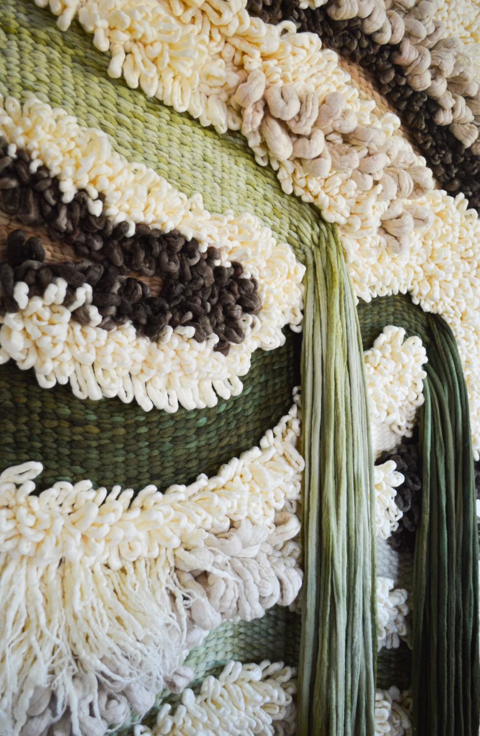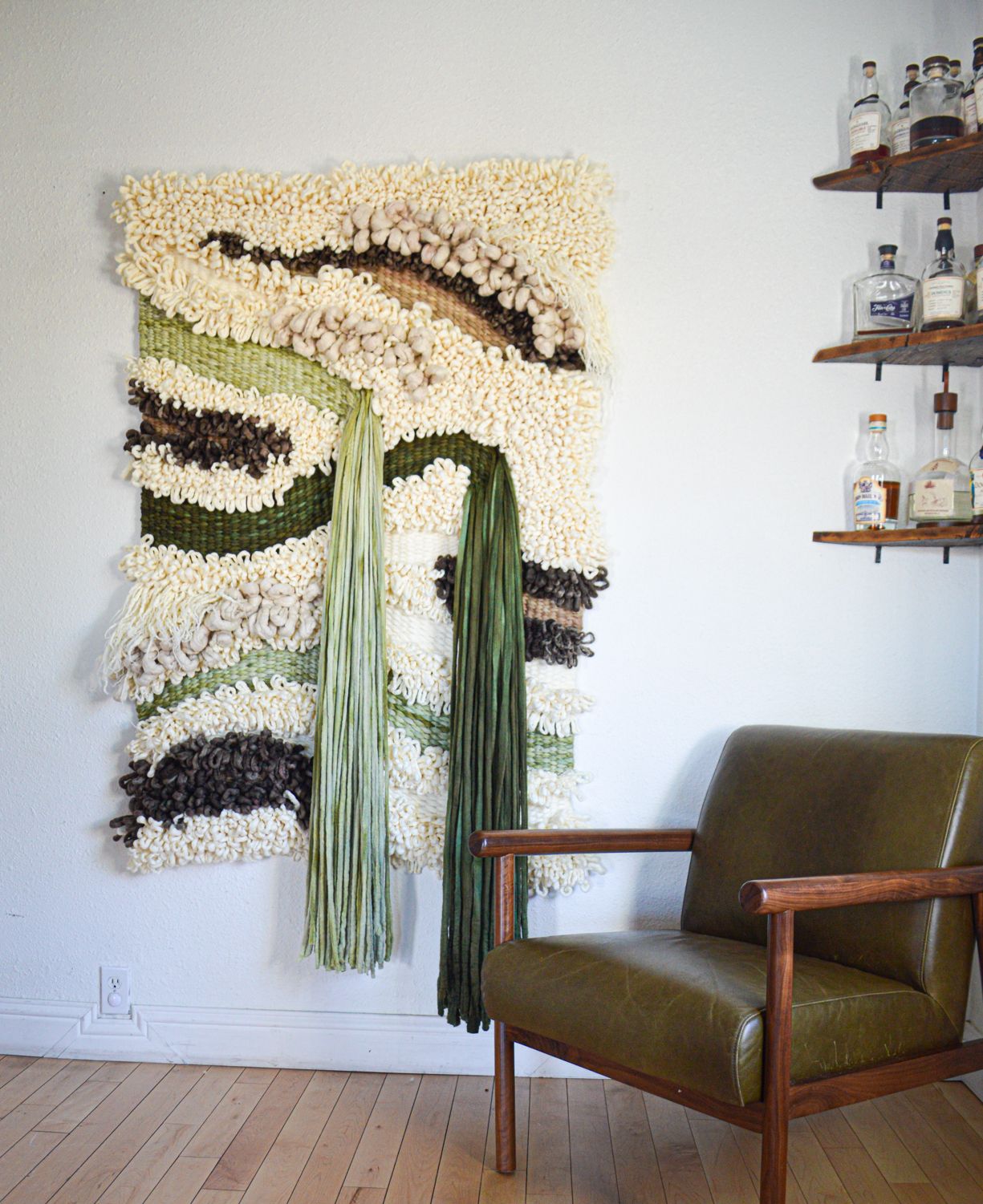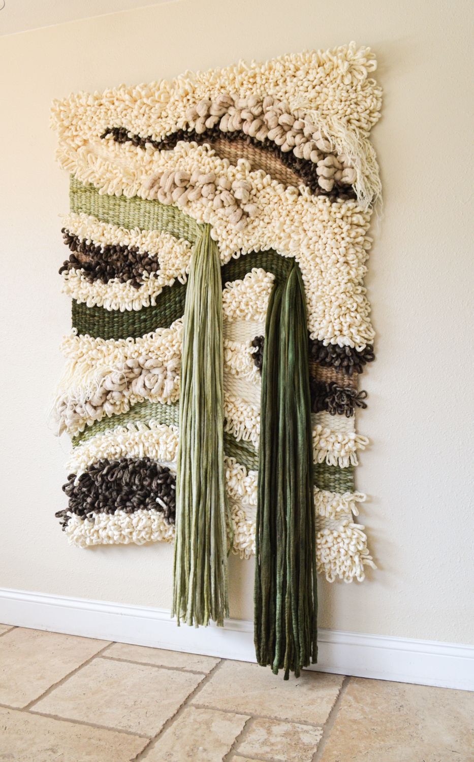 Bring nature’s serene elegance into your space with “Twin Pines,” a handwoven textile masterpiece inspired by rolling landscapes and organic movement. This fiber art piece is crafted with a Merino wool and hand-dyed fibers in earthy tones—creamy ivory, mossy green, and deep espresso—evoking the textures of forests, hills, and flowing water.